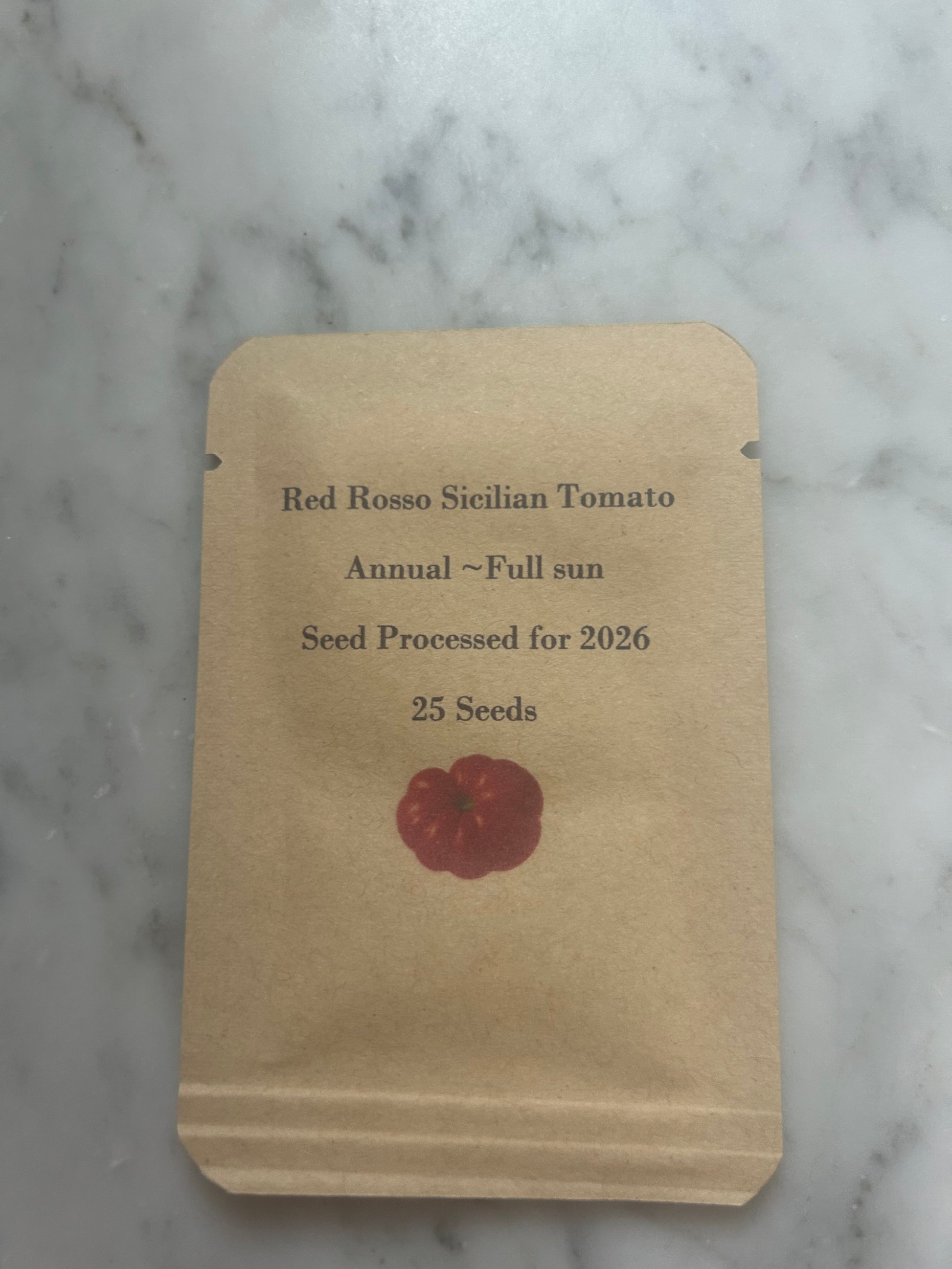 Red Rosso Sicilian: Beautiful, great, rich-tasting, medium-sized (about 5 oz), ribbed-shaped tomato. Nice hollow cores that make these tomatoes suitable for stuffing. Also, make a nice sauce—80 days from transplant to harvest.
